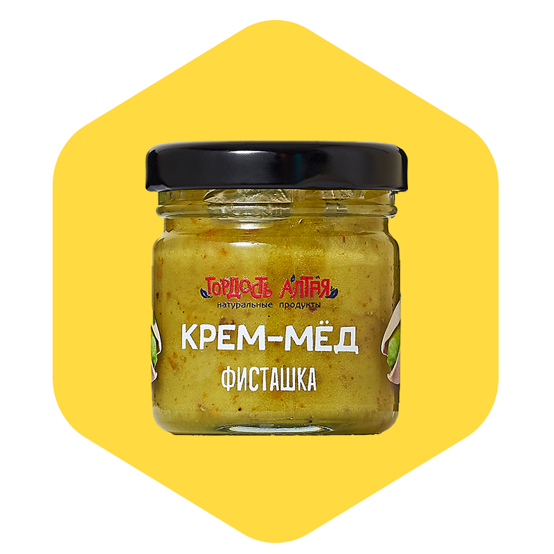 Состав: Крем-мёд (взбитый цветочный мёд из Алтая), дроблёные фисташки.